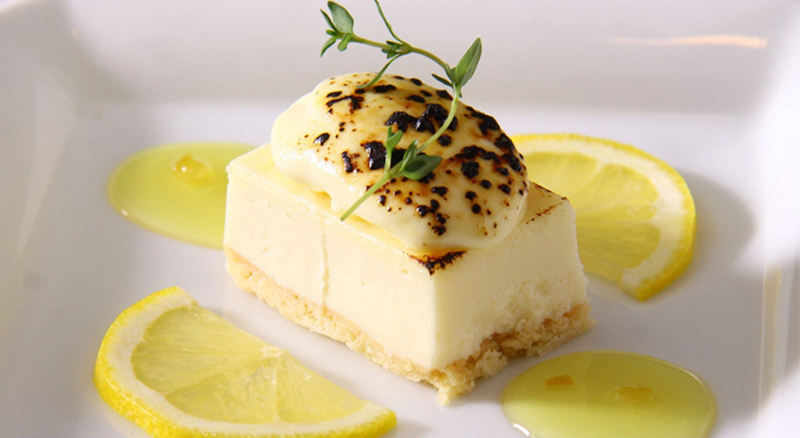 - その上にチーズケーキベースをトッピングし、スライスレモン、レモンソースを飾る。