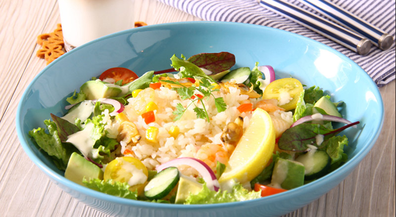 2. 炊き上がったピラフを皿に盛り付け、まわりにカットした野菜を盛り付け、仕上げに分量外のドレッシングを適量かける。